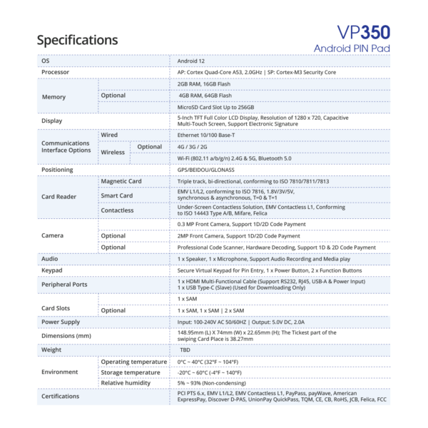 | Certifications | PCI PTS 6.x, EMV L1/L2, EMV Contactless L1, PayPass, payWave, American ExpressPay, Discover D-PAS, UnionPay QuickPass, TQM, CE, CB, RoHS, JCB, FeliCa, FCC |