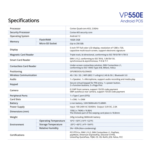 | Certifications | PCI PTS 6.x, EMV L1/L2, EMV Contactless L1, payWave, PayPass, American ExpressPay, Discover D-PAS, UnionPay QuickPass, TQM, CE, CB, RoHS, JCB, Felica, FCC |